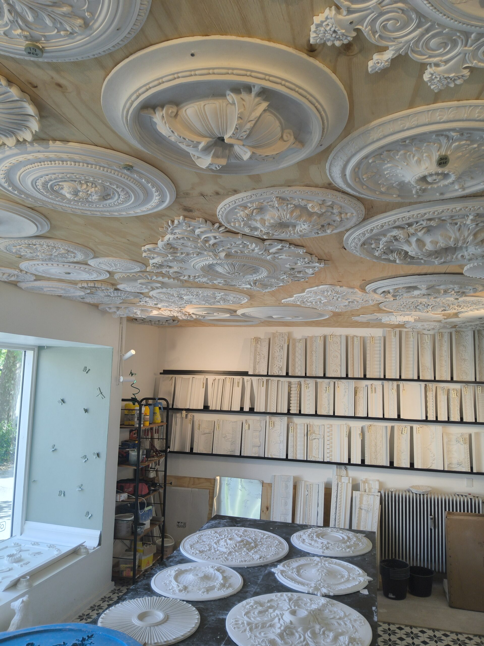 I vores charmerende butik i Lyngby kan du se et udvalg af vores stuk og måske være heldig at opleve vores dygtige stukkatører i gang med deres kreative håndværk.